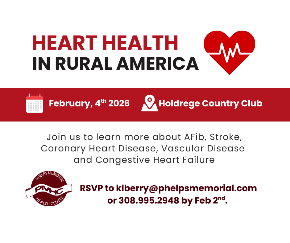 Phelps Memorial Health Center is inviting the community to a special educational event focused on improving heart health. “Heart Health in Rural America” will be held Wednesday, February 4, 2026, from 6:00p.m.–7:30 p.m. at the Holdrege Country Club, 314 W. 18th Street. A complimentary meal will be provided.